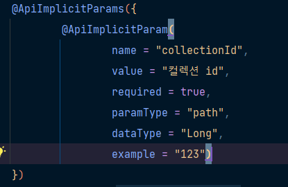 @ApiImplicitParam 혹은 @ApiParam의 example을 이용해 파라미터 값의 예시를 정해주면 해당 로그가 사라진다.